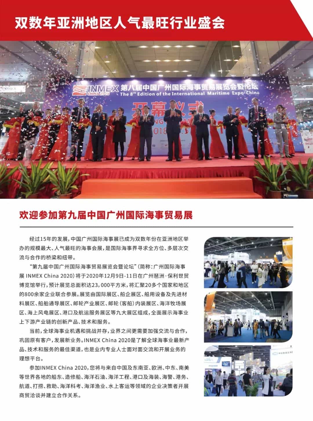第九屆中國(guó)廣州國(guó)際海事貿(mào)易展覽會(huì)暨論壇(簡(jiǎn)稱(chēng):廣州國(guó)際海事展 INMEX China 2020)將于2020年12月9日-11日在廣州琶洲·保利世貿(mào)博覽館舉行,預(yù)計(jì)展覽總面積達(dá)23,000平方米,將匯聚20多個(gè)國(guó)家和地區(qū)的800余家企業(yè)聯(lián)合參展。