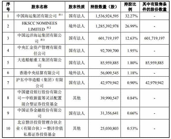 本次發(fā)行完成后,中遠(yuǎn)海能將新增有限售條件流通股7.3億股,總股本增至47.6億股。其中中遠(yuǎn)海運(yùn)集團(tuán)對中遠(yuǎn)海能的持股比例由38.56%上升至45.28%,包括通過中國海運(yùn)集團(tuán)間接持有的中遠(yuǎn)海能股權(quán)比例32.64%,以及直接持有股權(quán)比例12.63%,仍為中遠(yuǎn)海能的間接控股股東。另外,大船集團(tuán)對中遠(yuǎn)海能的持股比例為1.8%,在中遠(yuǎn)海能前10名股東中持股比例排名第五。滬東中華對中遠(yuǎn)海能的持股比例為0.9%,在前10名股東中持股比例排名第七。
