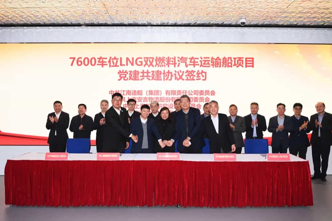 1月17日,中國(guó)船舶集團(tuán)有限公司旗下江南造船(集團(tuán))有限責(zé)任公司聯(lián)合中國(guó)船舶工業(yè)貿(mào)易有限公司與上海汽車(chē)集團(tuán)股份有限公司旗下上汽安吉物流股份有限公司正式簽訂2艘7600車(chē)雙燃料動(dòng)力汽車(chē)運(yùn)輸船(PCTC)建造合同。