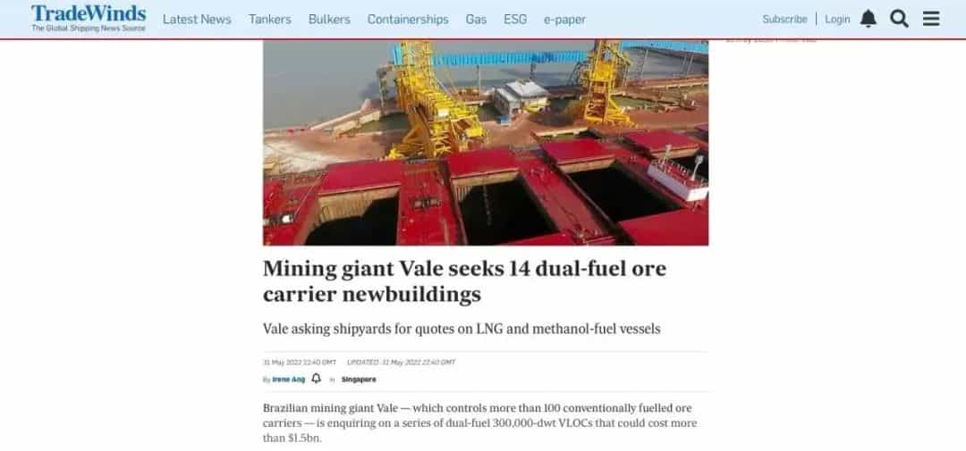 巴西礦業(yè)巨頭--淡水河谷計劃建造全球首批30萬噸級雙燃料超大型礦砂船(VLOC),這份價值超過120億元人民幣的散貨船大單,有望全部交由中國船廠建造。