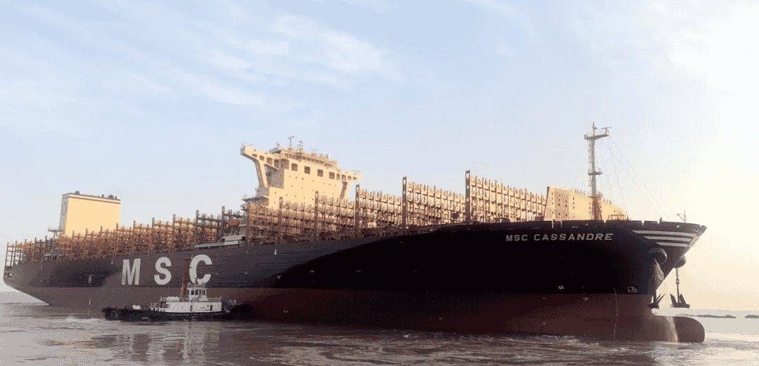 近日,由江蘇揚子江船業(yè)集團公司為SEASPAN公司建造的,第五艘12200TEU超大型集裝箱船--“MSC CASSANDRE”號離開船廠碼頭,開啟首航。