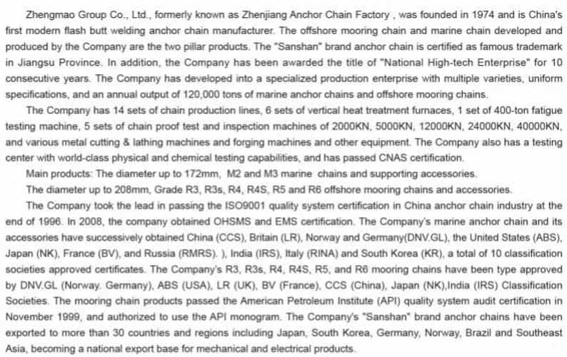 正茂集團有限責(zé)任公司前身是鎮(zhèn)江錨鏈廠,始建于1974年,距離上海約2小時車程,是中國首家現(xiàn)代化的電焊錨鏈制造企業(yè)。