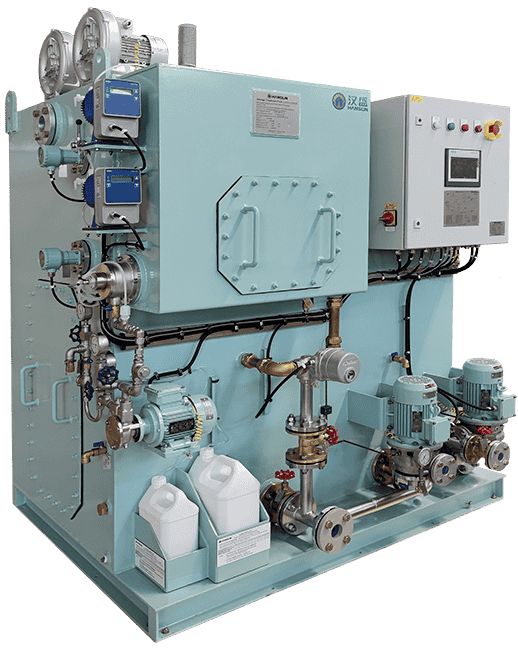 由于在真空狀態(tài)下,水的蒸發(fā)溫度降低,有利于船舶廢熱的再利用,是一種節(jié)能海水淡化裝置??筛鶕?jù)產(chǎn)水量需求,提供單級到多級蒸發(fā)造水機。