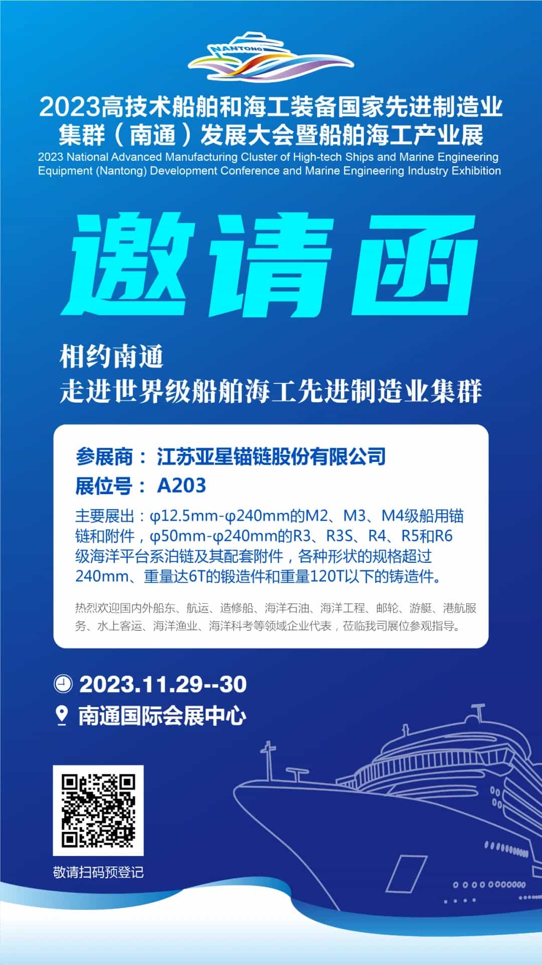 2023年11月29-30日,南通國際會展中心A203展位,亞星錨鏈與全球船舶人相約南通,走進世界級船舶海工先進制造業(yè)集群!