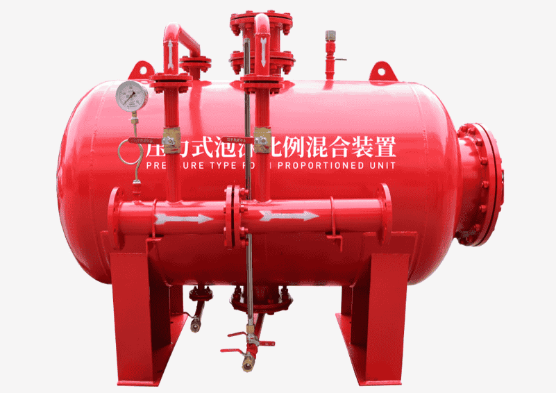消防壓力水流經(jīng)該設(shè)備時(shí),比例混含器將其按比例分流,其中一小部分水進(jìn)入泡沫液儲(chǔ)罐夾層擠壓膠囊,置換出泡沫液與消防水在比例混合器內(nèi)混合形成相應(yīng)比例的泡沫混合液,并輸送給泡沫噴射裝置,直接向火災(zāi)保護(hù)區(qū)進(jìn)行滅火工作。