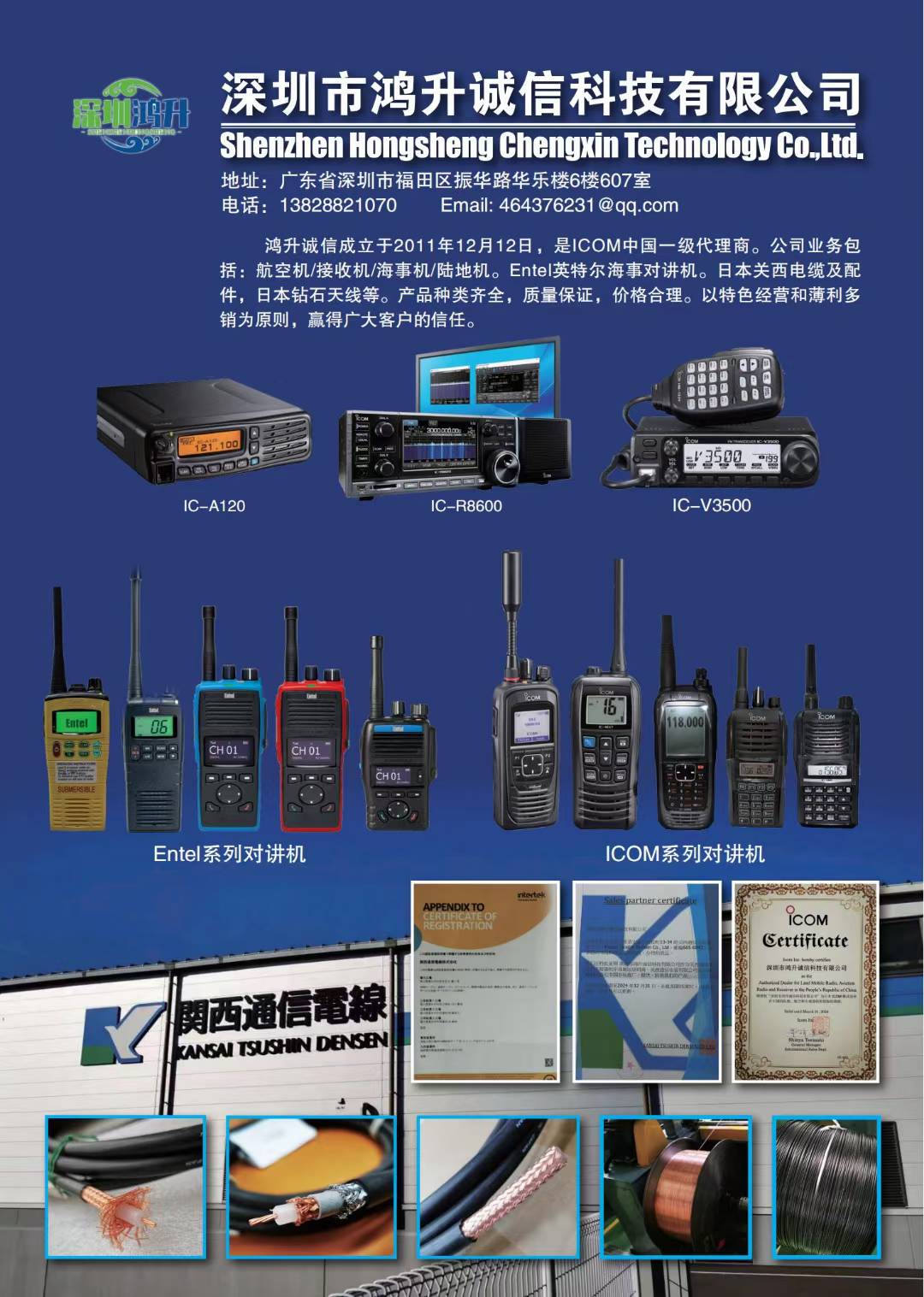 Shenzhen Hongsheng Chengxin Technology Co., Ltd:It is the first-level agent of ICOM in China. The products include Entel Intel marine walkie-talkies, aircraft receivers, maritime machines, land machines, etc.