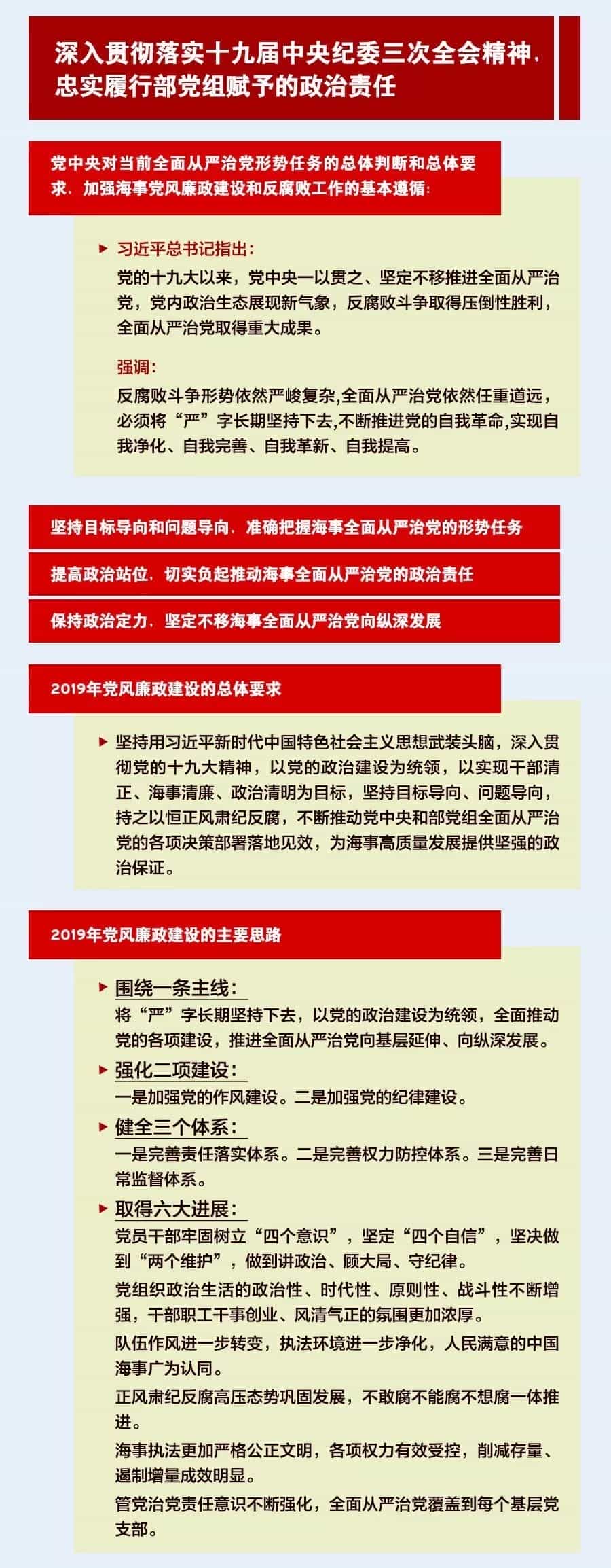 會上,曹德勝局長、黨組書記傳達(dá)了何建中副部長在2019年全國海事工作報(bào)告上的批示,作了題為《牢記新使命 展現(xiàn)新作為 開創(chuàng)新局面 全力推動海事高質(zhì)量發(fā)展》的工作報(bào)告,總結(jié)了2018年的工作成績及提出了對2019工作的展望。會上,曹德勝局長、黨組書記還作了題為《堅(jiān)定不移推進(jìn)全面從嚴(yán)治黨 以優(yōu)良作風(fēng)嚴(yán)明紀(jì)律助力海事高質(zhì)量發(fā)展》的直屬海事系統(tǒng)黨風(fēng)廉政建設(shè)工作報(bào)告。
