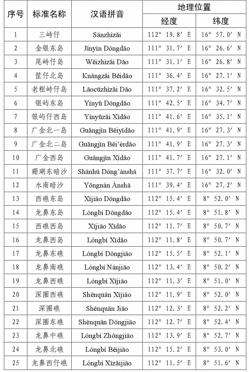 公告稱(chēng),為進(jìn)一步規(guī)范有關(guān)地名的使用,現(xiàn)將我國(guó)南海部分島礁和海底地理實(shí)體的標(biāo)準(zhǔn)名稱(chēng)予以公布。中國(guó)地名委員會(huì)1983年4月受權(quán)公布的《我國(guó)南海諸島部分標(biāo)準(zhǔn)地名》繼續(xù)有效,請(qǐng)社會(huì)各界規(guī)范使用已公布的標(biāo)準(zhǔn)名稱(chēng)。
