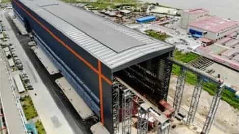 該車間高50.05米,長435米,單跨跨度為45米,車間配置6臺行車,為目前國內(nèi)最高、跨度最大的單層室內(nèi)總裝及分段總組車間。室內(nèi)船臺不僅大大提升了龍穴廠區(qū)的造船能力,也改善了造船生產(chǎn)環(huán)境、提升了產(chǎn)品建造質(zhì)量,完美解決了長期困擾生產(chǎn)的雨季問題。