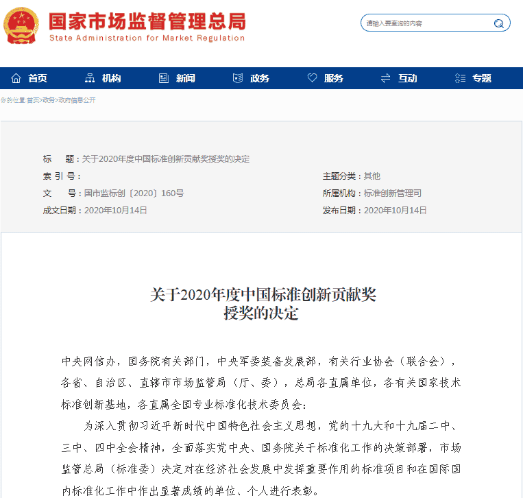 “中國標(biāo)準(zhǔn)創(chuàng)新貢獻(xiàn)獎”是由國家市場監(jiān)督管理總局(國家標(biāo)準(zhǔn)化管理委員會)設(shè)立的獎項(xiàng),是我國標(biāo)準(zhǔn)化領(lǐng)域的最高榮譽(yù)。