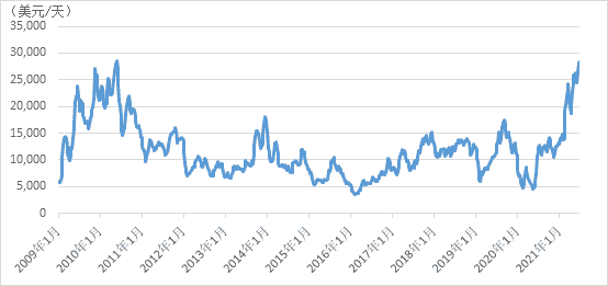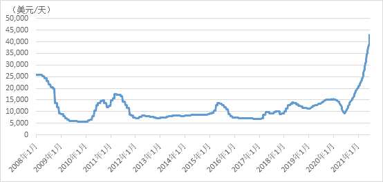 受疫情反復(fù)影響,全球制造業(yè)復(fù)工復(fù)產(chǎn)不均,港口擁堵及“集裝箱只出不進(jìn)”等因素導(dǎo)致船隊(duì)效率下降,市場(chǎng)“一箱難求”大幅推高運(yùn)費(fèi)收益。截至發(fā)稿日,箱船國(guó)際運(yùn)費(fèi)價(jià)格“直線”拉升,達(dá)到42969美元/天,同比增長(zhǎng)3.6倍,連續(xù)打破歷史紀(jì)錄。