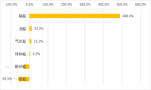 其中,箱船占比高達(dá)51.3%(以CGT計(jì))。從“5+1”六大船型(油散集氣客+特種船)累積成交量與2019-2020兩年同期成交均值對(duì)比來(lái)看,箱船增加4.9倍,油船、氣體船增加一成左右,特種船小幅增加,散貨船和客船降幅較大。