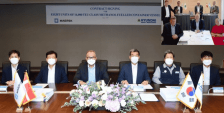 8月24日,現(xiàn)代重工集團(tuán)負(fù)責(zé)造船業(yè)務(wù)的二級(jí)控股公司韓國造船海洋與馬士基集團(tuán)攜手簽訂了8+4艘16000TEU級(jí)甲醇雙燃料動(dòng)力超大型集裝箱船的建造合同,合同總金額為16474億韓元(約合14.1億美元),相當(dāng)于每艘造價(jià)1.76億美元,備選訂單全部生效后總金額將達(dá)21.12億美元。