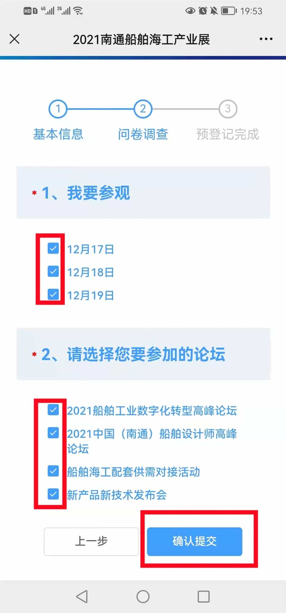 ★ 第四步:進(jìn)入問卷調(diào)查頁面,選擇要參觀的日期、論壇(可多選)后,點(diǎn)擊“確認(rèn)提交”。