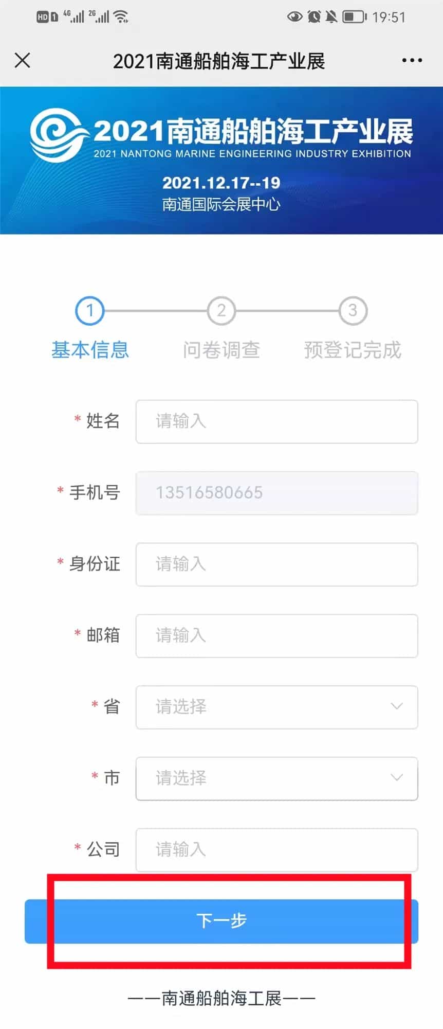 ★ 第三步:進(jìn)入基本信息登記頁面,如實填寫姓名、手機(jī)號、身份證號等信息后,點(diǎn)擊“下一步”。