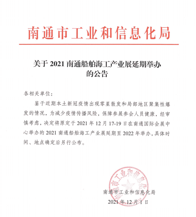 鑒于近期本土新冠疫情出現(xiàn)零星散發(fā)和局部地區(qū)聚集性爆發(fā)的情況,為減少疫情傳播風(fēng)險(xiǎn),保障參展參會(huì)人員健康,經(jīng)審慎考慮,決定將原定于2021年12月17-19日在南通國(guó)際會(huì)展中心舉辦的2021南通船舶海工產(chǎn)業(yè)展延期至2022年舉辦,具體時(shí)間、地點(diǎn)確定后另行公布。