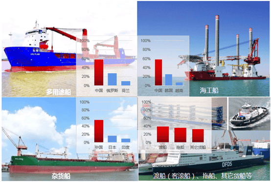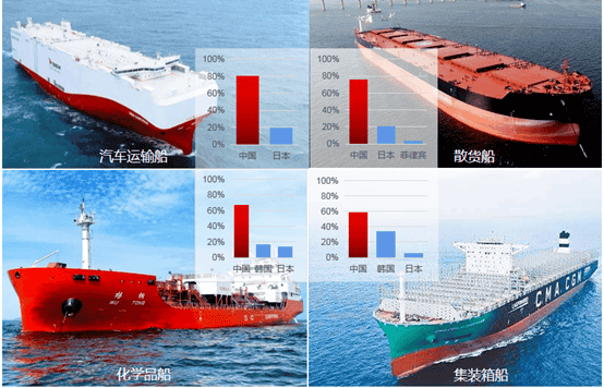 除在總量上繼續(xù)保持領先外,中國造船企業(yè)在各細分船型市場上持續(xù)發(fā)力,18個主要船型中,中國獲得10個船型的市場份額第一,其中在集裝箱船、散貨船、化學品船、多用途船(MPP)、海工船、汽車運輸船(PCC/PCTC)等船型的市場份額超過50%(絕對優(yōu)勢),產(chǎn)品結構大幅優(yōu)化,高技術、高附加值主力船型不斷涌現(xiàn)。