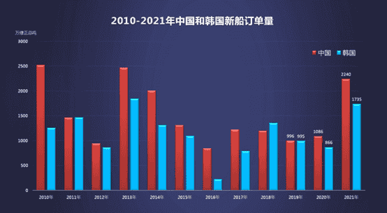 2021年,中韓造船業(yè)的搶單大戰(zhàn)終于塵埃落定。曾經(jīng)在上半年訂單量一路領先的韓國船企在最后時刻“放慢腳步”最終被中國反超。而在連續(xù)三年落后韓國之后,中國船企終于奪回世界第一寶座。