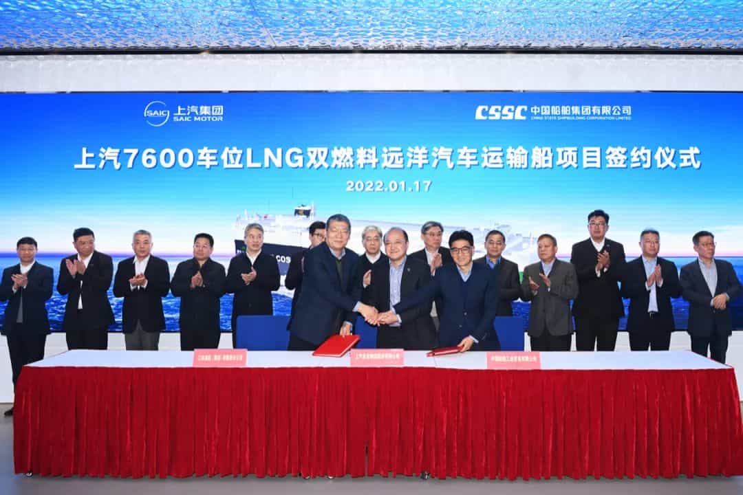 1月17日,中國(guó)船舶集團(tuán)有限公司旗下江南造船(集團(tuán))有限責(zé)任公司聯(lián)合中國(guó)船舶工業(yè)貿(mào)易有限公司與上海汽車(chē)集團(tuán)股份有限公司旗下上汽安吉物流股份有限公司正式簽訂2艘7600車(chē)雙燃料動(dòng)力汽車(chē)運(yùn)輸船(PCTC)建造合同。