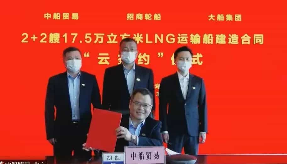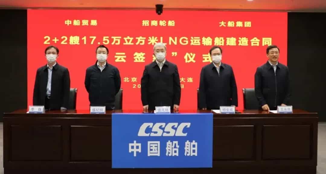 3月31日,中國船舶集團(tuán)有限公司旗下大連船舶重工集團(tuán)有限公司聯(lián)合中國船舶工業(yè)貿(mào)易有限公司,與招商局集團(tuán)有限公司旗下招商局能源運(yùn)輸股份有限公司在上海、深圳、大連及北京四地以“云簽約”方式正式簽署2+2艘17.5萬立方米大型液化天然氣(LNG)運(yùn)輸船建造合同。