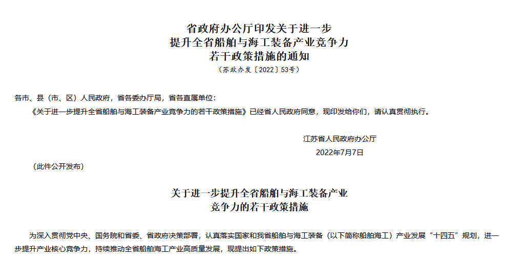 近日,江蘇省人民政府官網(wǎng)正式發(fā)布《關(guān)于進(jìn)一步提升全省船舶與海工裝備產(chǎn)業(yè)競(jìng)爭力的若干政策措施》(簡稱政策措施)。