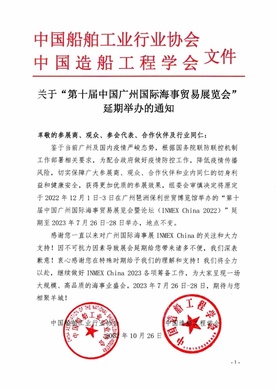 將原定于2022年12月1日-3日在廣州琶洲保利世貿(mào)博覽館舉辦的“第十屆中國廣州國際海事貿(mào)易展覽會暨論壇(INMEX China 2022)”,延期至2023年7月26日-28日舉辦,地點不變。