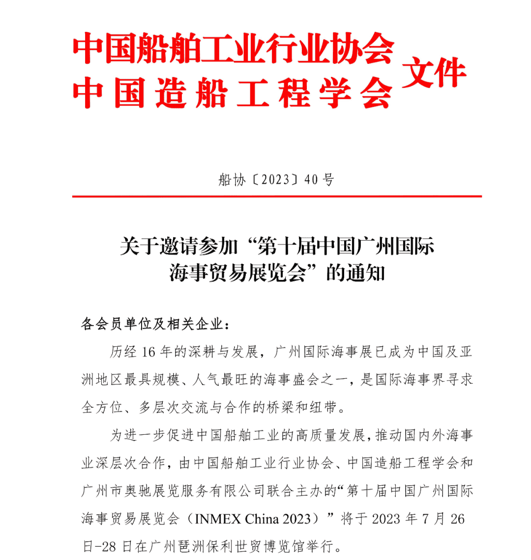 為進(jìn)一步促進(jìn)中國(guó)船舶工業(yè)的高質(zhì)量發(fā)展,推動(dòng)國(guó)內(nèi)外海事業(yè)深層次合作,由中國(guó)船舶工業(yè)行業(yè)協(xié)會(huì)、中國(guó)造船工程學(xué)會(huì)和廣州市奧馳展覽服務(wù)有限公司聯(lián)合主辦的“第十屆中國(guó)廣州國(guó)際海事貿(mào)易展覽會(huì)(INMEX China 2023)”,將于2023年7月26-28日,在廣州琶洲保利世貿(mào)博覽館一樓2號(hào)館舉行。