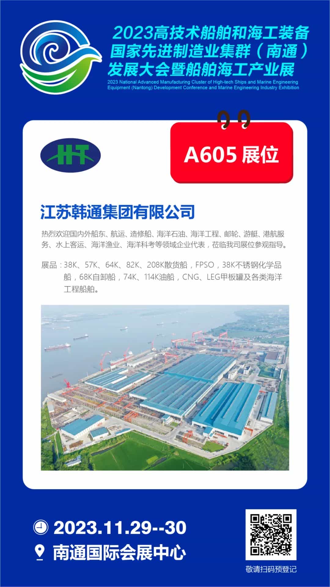 2023年11月29-30日,南通國際會展中心A605展位,韓通集團與全球船舶人相約南通,走進世界級船舶海工先進制造業(yè)集群!