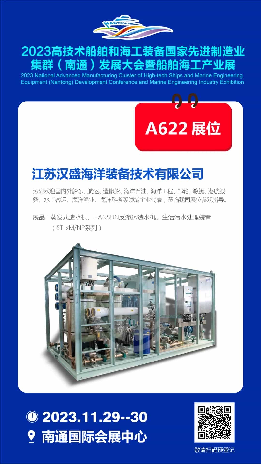 2023年11月29-30日,南通國際會展中心A622展位,漢盛海裝與全球船舶人相約南通,走進世界級船舶海工先進制造業(yè)集群!