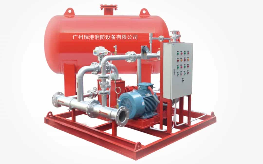 消防壓力水流經(jīng)該設(shè)備時(shí),比例混含器將其按比例分流,其中一小部分水進(jìn)入泡沫液儲(chǔ)罐夾層擠壓膠囊,置換出泡沫液與消防水在比例混合器內(nèi)混合形成相應(yīng)比例的泡沫混合液,并輸送給泡沫噴射裝置,直接向火災(zāi)保護(hù)區(qū)進(jìn)行滅火工作。