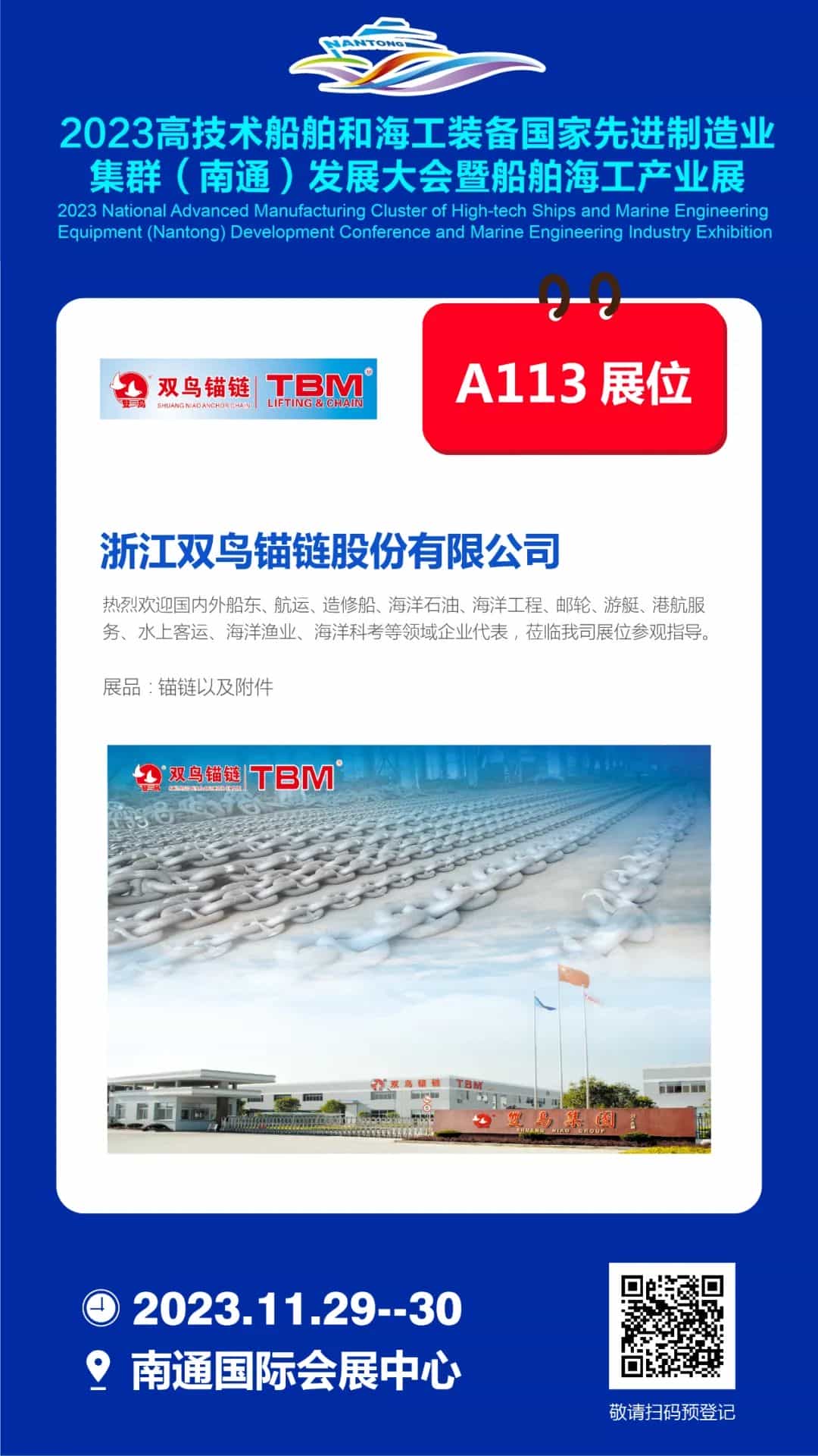 2023年11月29-30日,南通國際會展中心A113展位,雙鳥錨鏈與全球船舶人相約南通,走向深藍(lán),打造世界級船舶海工集群!