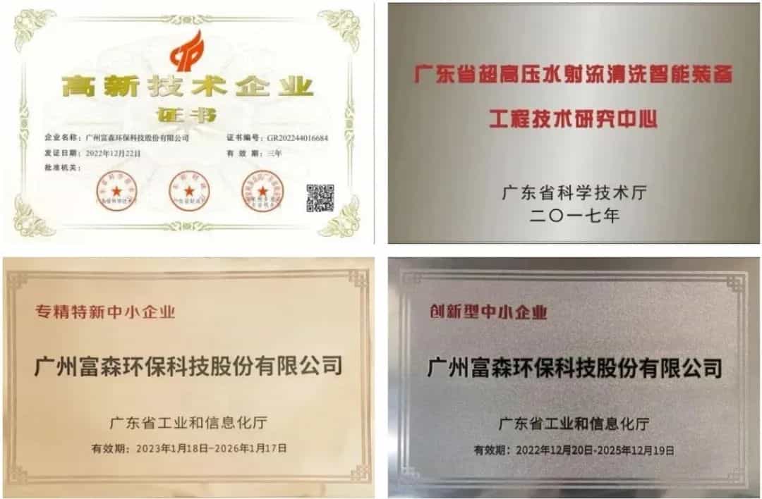 富森環(huán)保于2016年在新三板掛牌,并被認(rèn)定為國(guó)家高新技術(shù)企業(yè),2017年被認(rèn)定為廣東省超高壓水射流清洗智能裝備工程技術(shù)研究中心,2022年被認(rèn)定為“專精特新中小企業(yè)”和“創(chuàng)新型中小企業(yè)”。