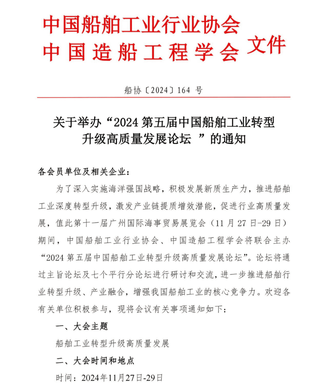 關(guān)于舉辦“2024第五屆中國船舶工業(yè)轉(zhuǎn)型升級高質(zhì)量發(fā)展論壇”的通知