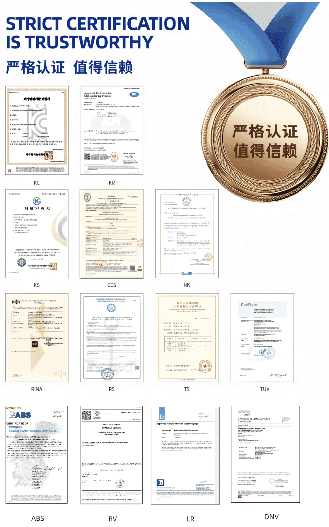 華日法蘭憑借過硬的技術和優(yōu)良的品質,相繼通過LR、KR、BV、DNV-GL、RINA、ABS、NK、CCS、RS各大船級認證以及KC、KS、TUV和ISO9001質量體系認證。